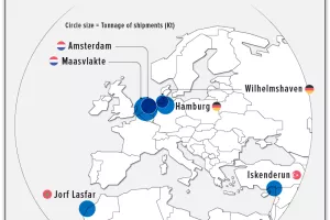 Što se tiče isporuke naftnih derivata, glavno odredište su bile ogromne luke u Rotterdamu i Antwerpenu u kojima se nalaze velike rafinerije, a neke su pošiljke svoje odredište našle i u Mediteranu.