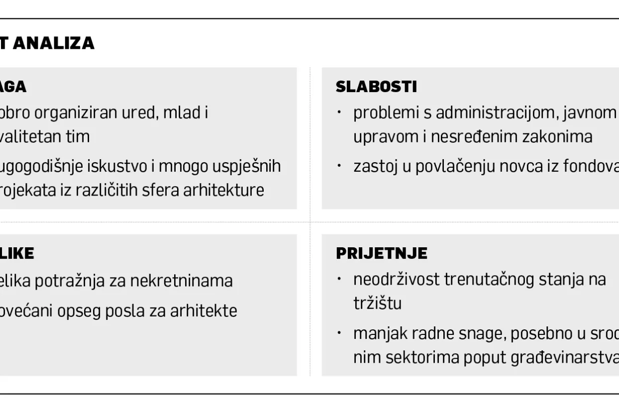 Na njihovim službenim stranicama, u dijelu naslovljenom 'o nama', stoji da im situacija na tržištu ne ostavlja mogućnost da biraju tipove projekata kojima će se baviti. Od trenutka pisanja tog teksta situacija se ipak bitno popravila. I dalje se, međutim, susreću s brojnim zaprekama, ponajprije u područjima kao što su regulativa i administracija.– Taj dio pisali smo u doba krize, kada je situacija doista bila kompleksna i morali smo raditi sve i svašta kako bismo zadržali glavu iznad vode. U tome smo i uspjeli, ured je bio rentabilan. U našoj branši najviše problema imamo s administracijom, državnom upravom i nesređenim zakonima. Administracija je zapreka u svakom pogledu, od prevelikog broja ljudi koji rade u javnoj upravi do golemih razlika u neto/bruto plaći, pogotovo ako se usporedimo s nekim nama sličnim državama kao što je Poljska. Nedavno je netko izračunao da morate zaraditi najmanje 12.500 kuna, čemu treba pridodati PDV i brojne druge troškove, da biste isplatili radniku bruto plaću od sedam i pol tisuća kuna o kojoj je govorila predsjednica Kolinda Grabar-Kitarović. To na kraju ispada oko osamnaest i pol tisuća kuna. U nekim drugim poslovima poduzetnici uplaćeni PDV mogu 'nadoknaditi' pri nabavljanju opreme ili materijala, ali kod arhitekata to nije slučaj. Sljedeći problem krije se u presporoj državnoj upravi, zbog čega se na potrebne dozvole katkad znalo čekati i do pola godine, što je posebno frustrirajuće kada svoj dio posla odradite za mjesec i pol do dva – naglašava Bašić i ponosno napominje da 4uHa sve dogovorene projekte uvijek uspijeva završiti 'u roku'.